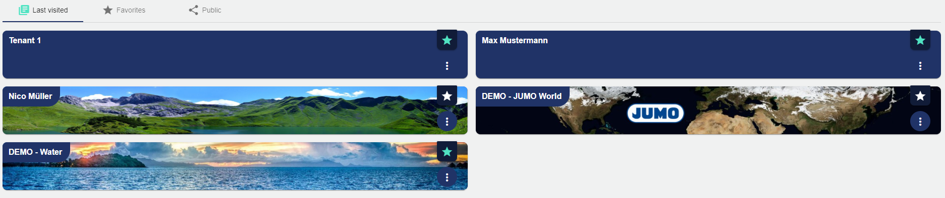 A Tenant is a higher-level area that you can create to manage a specific group of users. Dashboards - as the central element of the JUMO Cloud - are located in each of these Tenants. There are Public Tenants und Tenants with Restricted Access. You can also create Sub-tenants. You can save your personal tenants under the Favorites tab on the start page (homepage) of the JUMO Cloud.