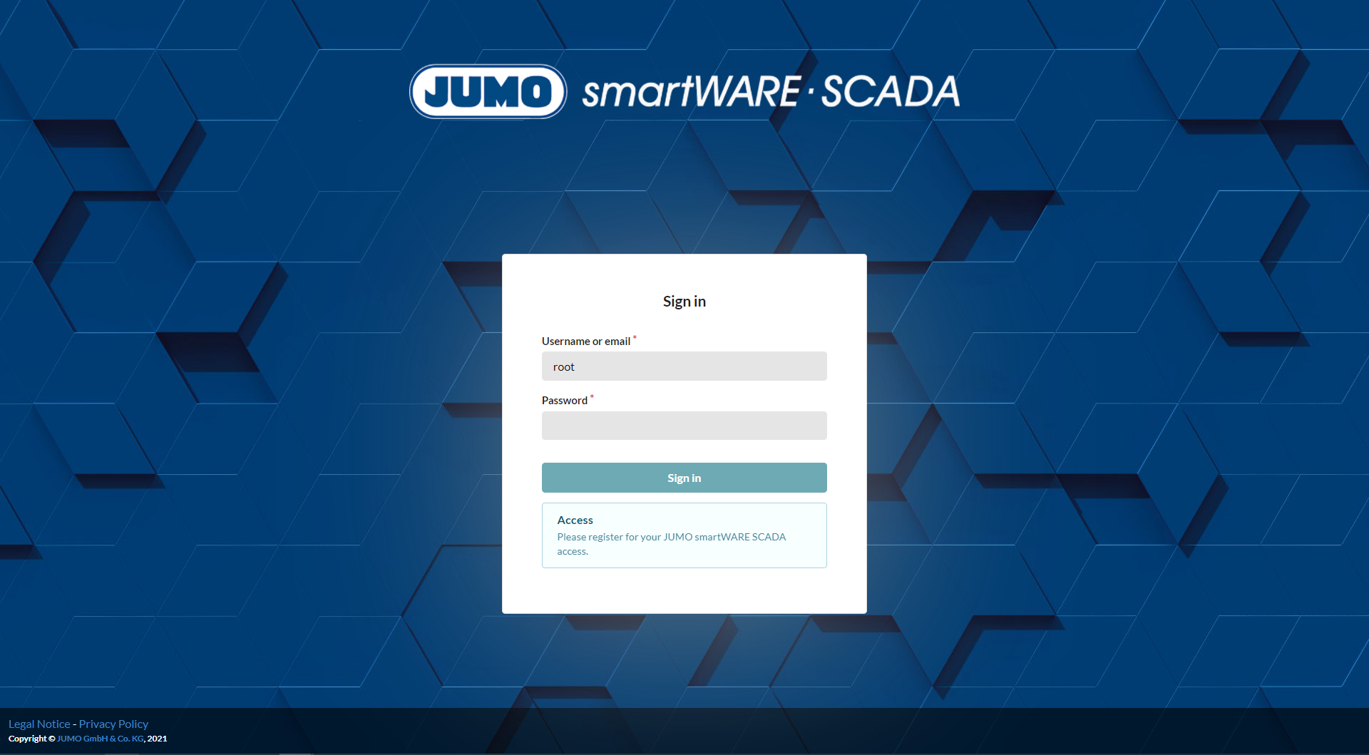 The start page of the JUMO smartWARE SCADA can be called up in the browser via the host name. The login works with the user "Root" and the corresponding password from the password list of the last step.
