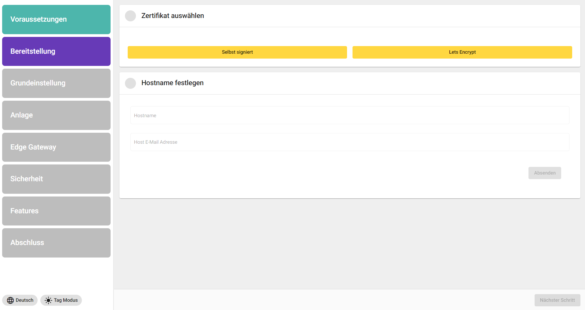 Provision | In the "Provision" sector, a certificate has to be signed and a host name has to be allocated. Select "Self-signed" to continue. Assign the name of the server/system on which you are installing the JUMO smartWARE SCADA as the host name (e.g.: smartware-scada or the correspondingly assigned DNS name the IT has given) and click on "Submit". ![]() Example host name, subsequently available in browser under http://smartware-scada or https://smartware-scada smartware-scada Customer-specific host name under Windows (optional addition) 1.) Opening the "host" file under path C:\Windows\System32\drivers\etc 2.) Enter the IP address 127.0.0.1 in the file followed by the desired host name. Example: 127.0.0.1 scada-silothermometrie 3.) In the installation steps of the JUMO smartWARE SCADA, the desired host name can then be entered in the Host name field 4.) JUMO smartWARE SCADA can be accessed with URL https://scada-silothermoetrie after the installation |