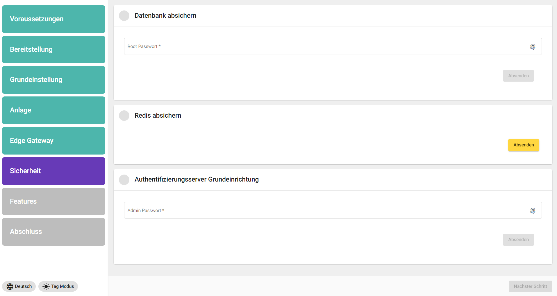 Security | In the security settings, a password is set or generated for the database and authentication server respectively. Passwords can be randomly generated here via the fingerprint icon (recommended). In the "Redis" tab, simply click on "Submit". ![]() |