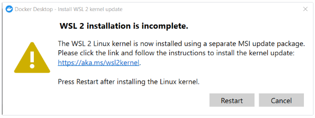 On Docker Desktop startup, Windows will prompt you to complete the WSL2 installation. The link in the prompt will take you to a website where WSL2 (Windows Subsystem for Linux 2) can be downloaded. All that needs to be done here is to execute "Step 4" and click on "Restart".