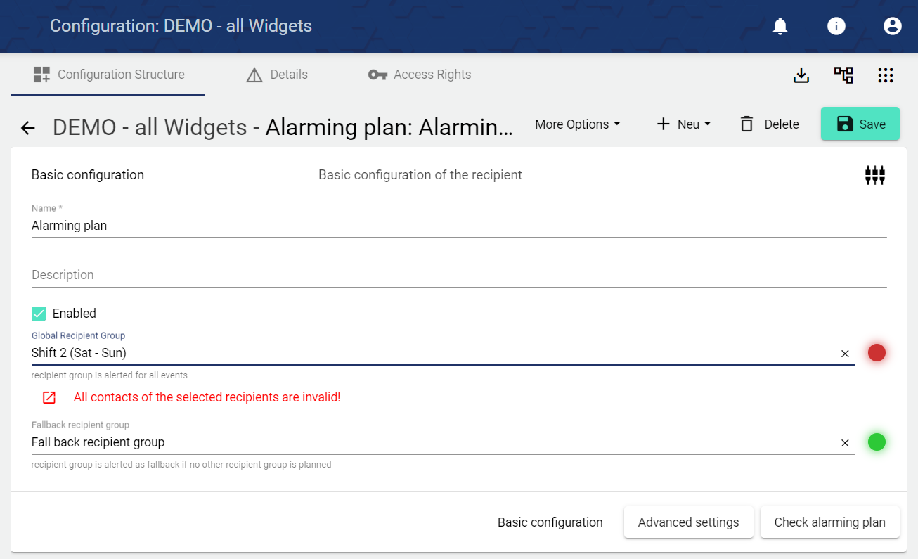 3.b) In addition to the widgets already mentioned in 3.a), there are corresponding additions in the configuration of the Alarming Plan. From now on it can be recognized if all settings, e.g. in the linked recipient group, have been made correctly. As in the widget, the alarming plan can be checked by date during configuration. If the alarm schedule was deactivated or activated via "Widget: Alarming plan timer", this can be viewed in the "Historical timer" tab.
