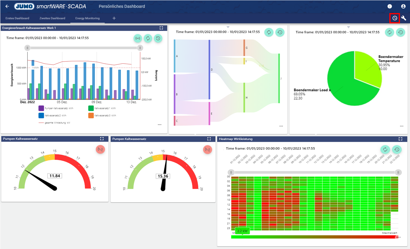 1.) The following widgets have been visually adapted and improved. A central time control has also been implemented. If the user now wants to view a time interval of the past month, for example, he can make this setting in a central place. The chosen widgets will then all display the selected time interval.