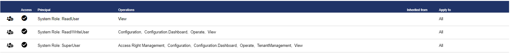 The table shows an overview of which access rights (operations) have been assigned to which role (principal). You can edit the access rights using the pencil, and delete them using the barrel.