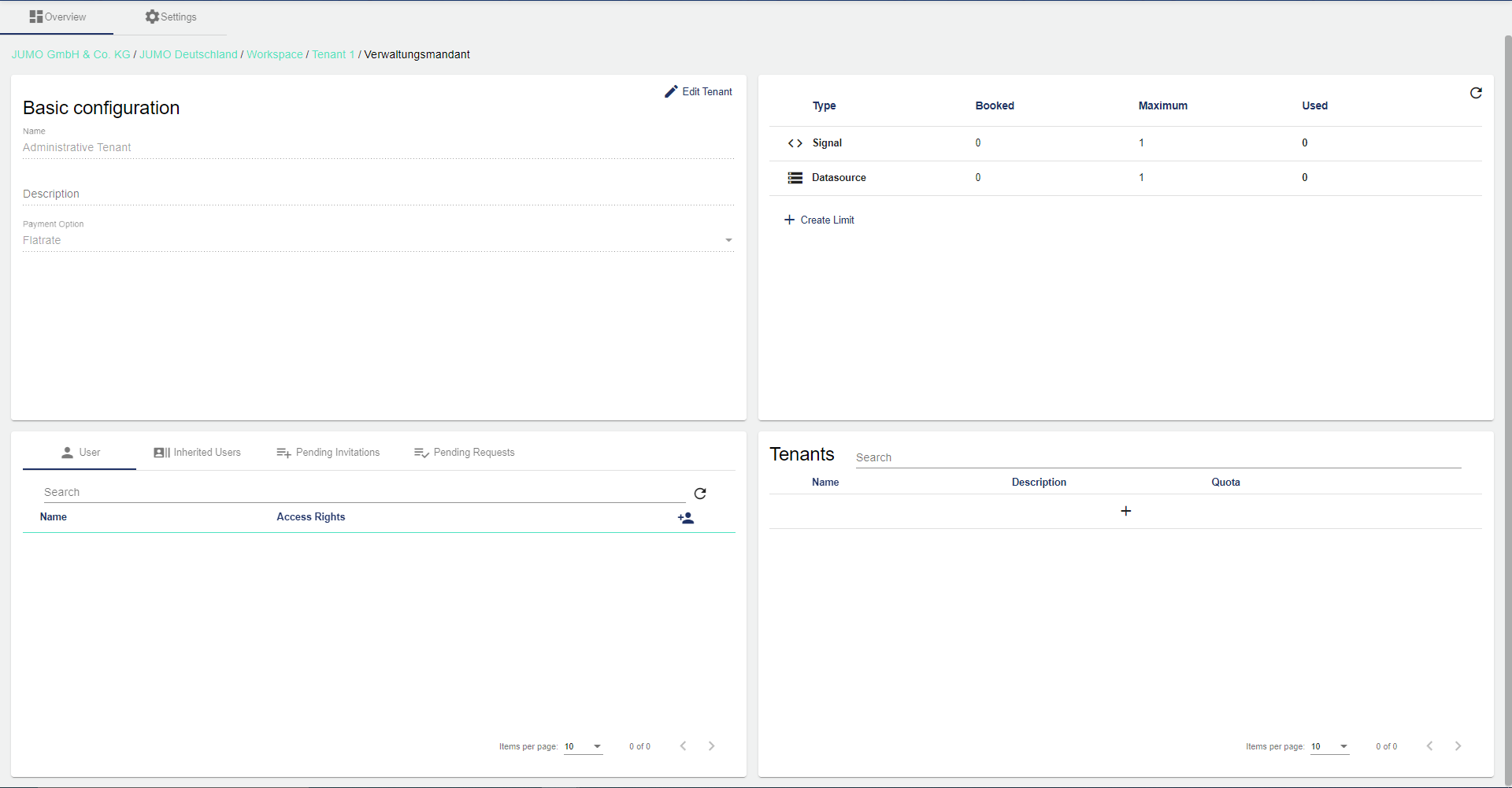 The Administration of a Tenant includes general Settings / information, a Control Operation Archive, an Overview about the number of Signals and Datasources used, and User Management including the Roles and Rights and all Sub-tenants.