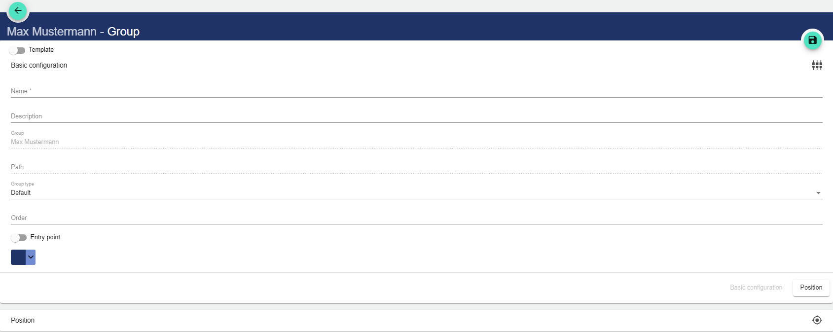 Assign the name of the Group in the Basic Configuration. The Description field is optional. The Group can also be created as a "template" (currently inactive). This allows you to simply add individual fields to the template in order to create new Groups. The "Group" field shows the group in which this group was created. The path is generated automatically by the system.