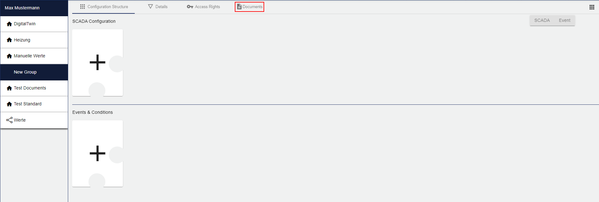 Using "DigitalTwin", a Group is created that adopts the combined settings of both "Standard" and "Documents". The Group is configured via the configuration structure. Documents can be uploaded via the "Documents" button.