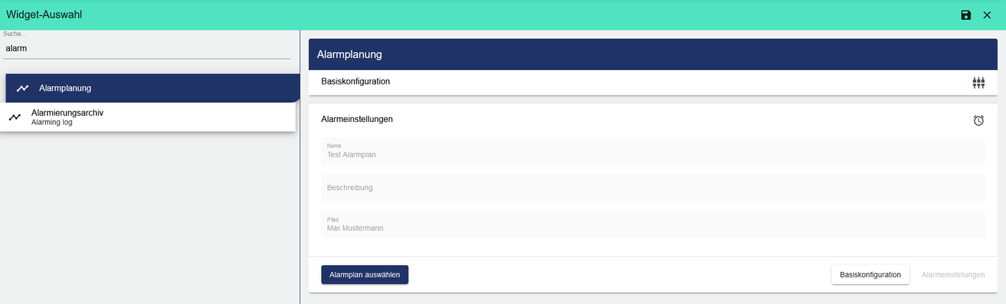 Once you have selected the Alarming Plan widget, you need to choose which Alarming Plan you want to use. Before this, only the title of the schedule is entered in the Basic Configuration. This can be displayed in the Dashboard later by checking Show Header. In the Widget: Alarm Planning, just select your Alarming Plan using the navigator.