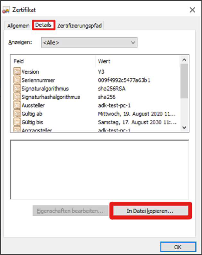 Click on "Next", now select "DER-coded binary X.509 (.CER)" as the data format and confirm this with "Next"