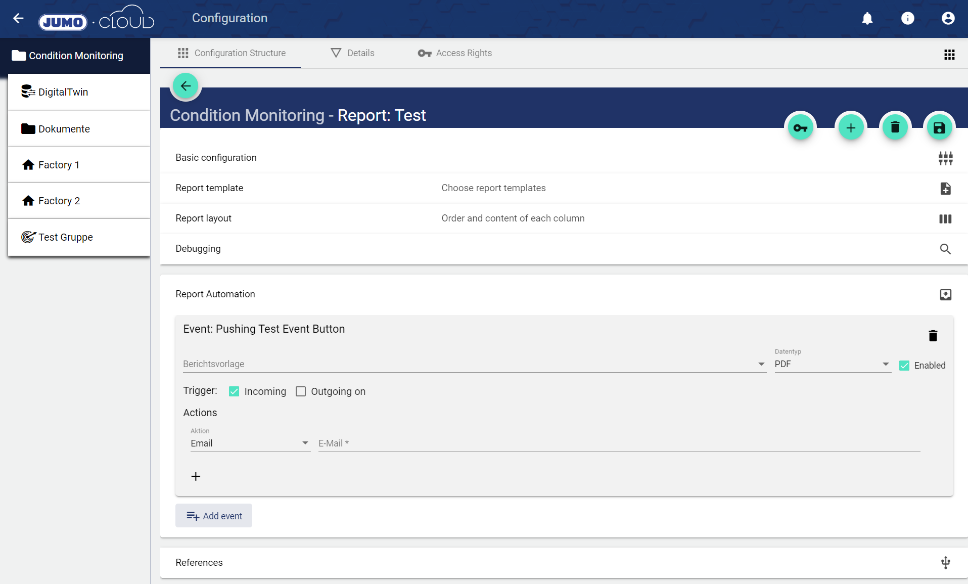 Via an event it is possible to send the report with an individual report template via PDF or CSV file via e-mail.