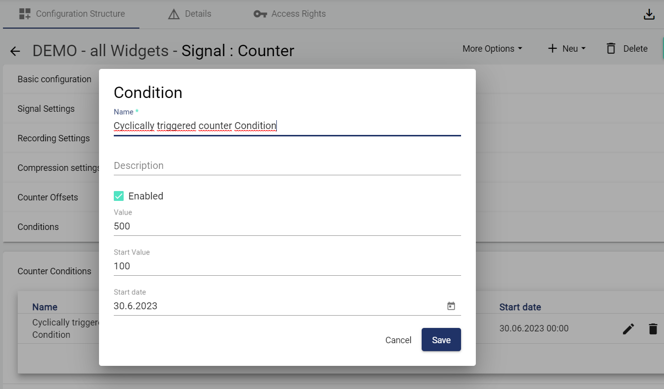 A counter condition is an optionally adjustable limit value that is triggered cyclically, e.g. every 500 operating hours. The value specifies how long the counter should count until another event is triggered. In our example value=500. The start value corresponds to an offset. By entering a start value, the counter condition can be triggered with a delay when it is run again. E.G.: Start value=100, means that on the next run the counter condition will only be triggered at 600 hours. The start date determines from when the counter is to count.