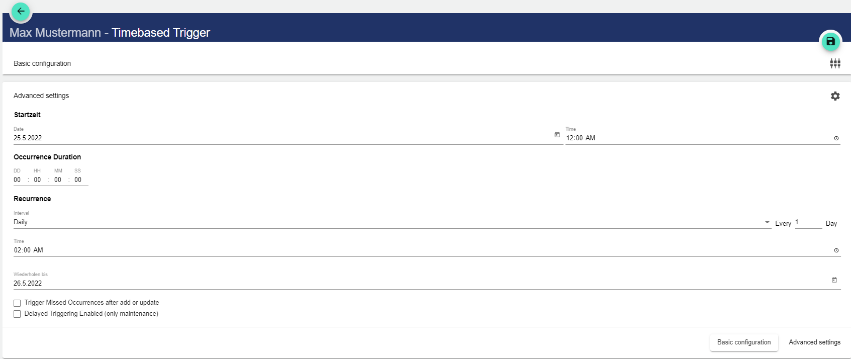 This is where you set the time-based trigger. A time and date is specified as the start time. You can also specify the duration of the event. In the second section, you can then schedule regular repetition. An interval at which the event is to be triggered and a timer are specified here. In the "Repeat until" field, a date is specified until which the repetition is valid and active. In addition, the options "Trigger missed events after add or update" and "Delayed triggering enabled (for maintenance)" can be activated as needed.