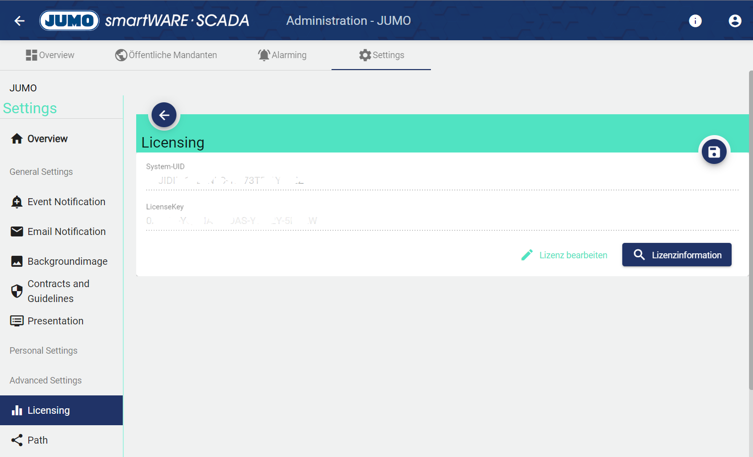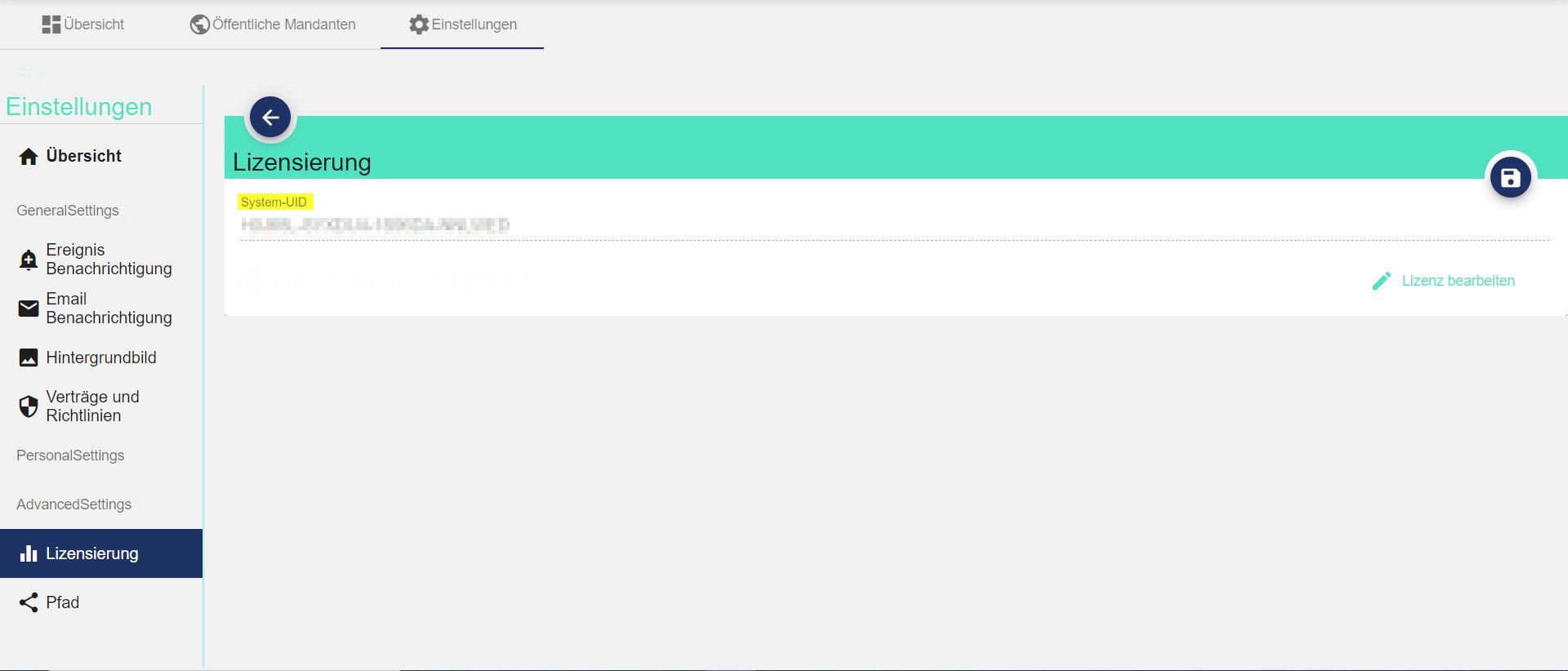 The UID of the respective SCADA Installation can be found in the central administration under Settings and Licensing. This settings overview can only be viewed in the top root client.