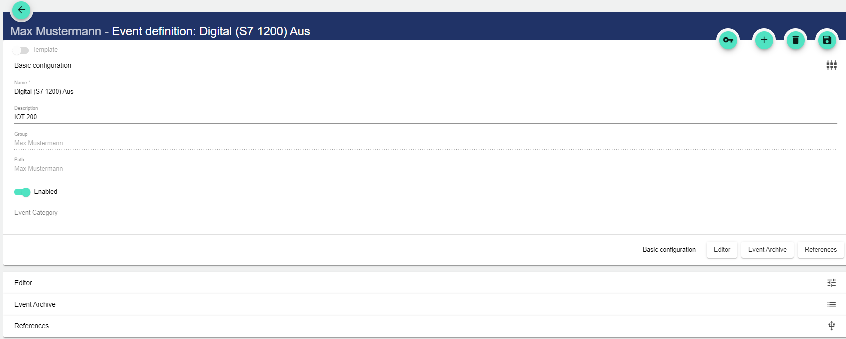 By selecting the "Event Definition" button, you can edit a Definition that was created earlier. A new Event Definition is created via the Plus button.