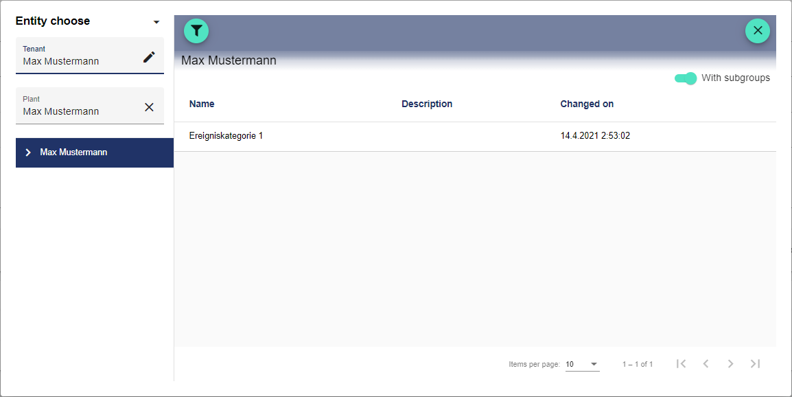 The Event Archive archives the activated events. It contains the event, the corresponding event category, the incoming and outgoing time of the event and the acknowledgment.