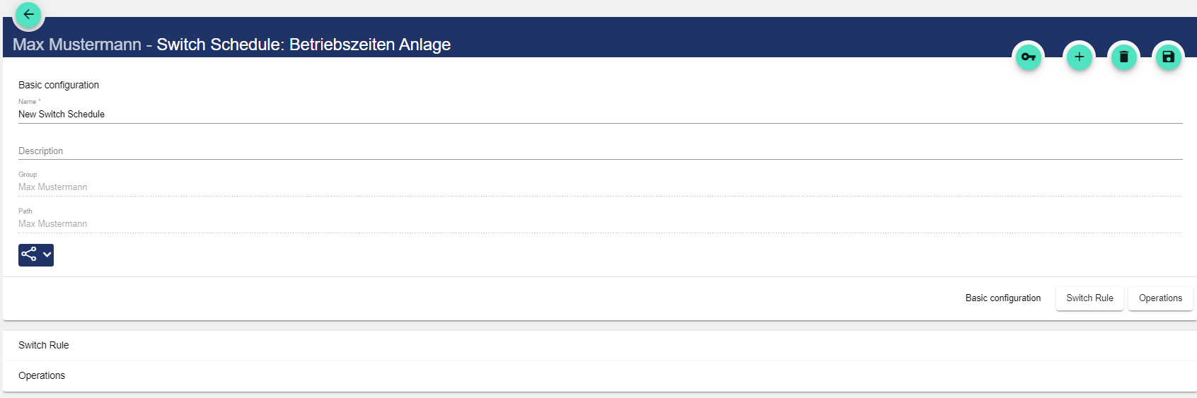 A new switching operation is created via the Plus button. Assign a name to the operation. In the "Switching Rule" field, you can select the previously created switching rule as a template.
