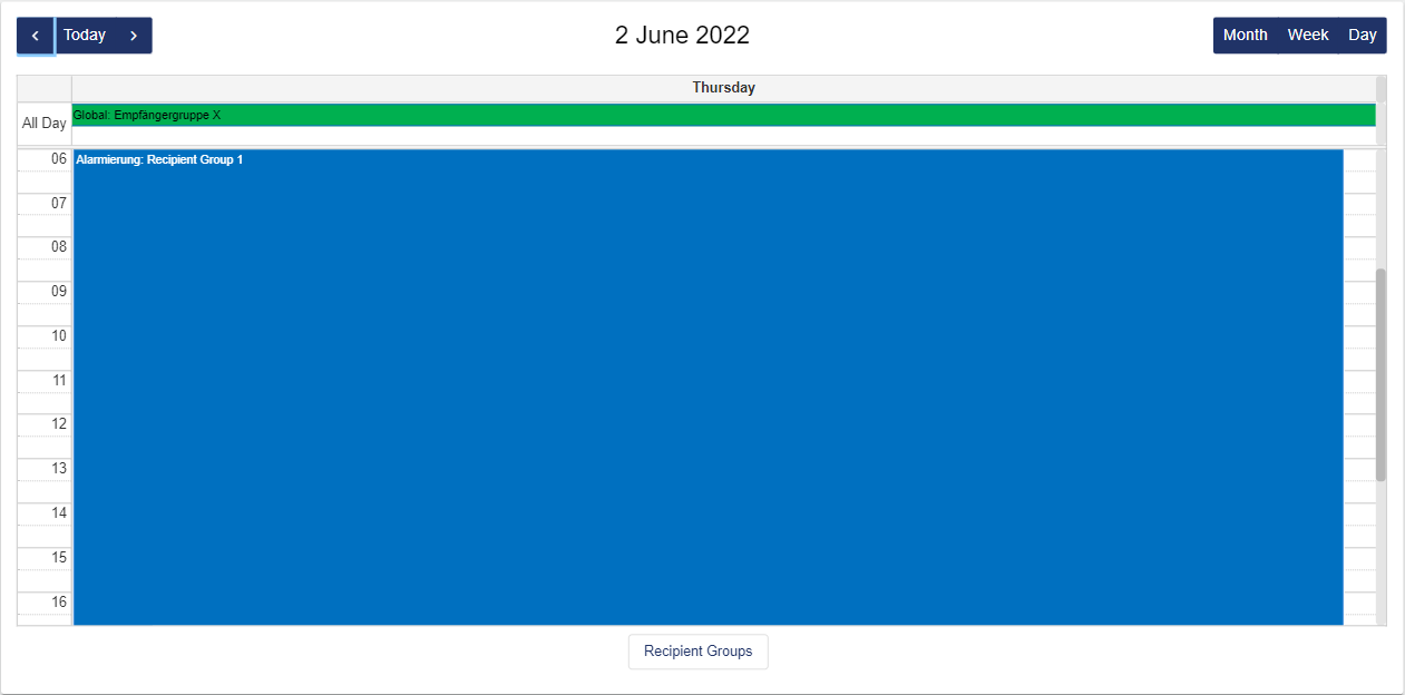 With Alarm Scheduling, you can assign an Alarm Schedule previously created in the configuration to a specific Recipient Group for specific time periods. The calendar view can be displayed in the widget as month, week or day. Here you can view past schedules and plan future ones. A selected Recipient Group can be regularly alerted to specific events using alarm scheduling. As soon as the Event occurs, the group is alerted. By default, the "Global Recipient Group" is selected. The " Global Recipient Group" is continuously alerted should the event occur.