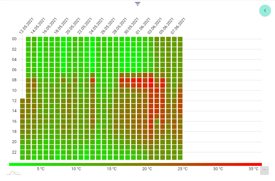 The Heatmap diagram is mainly used in the energy industry in the context of the ISO 50.001 Norm. It represents 24 average signal values per day. Historical periods can be viewed and evaluated via the upper green arrow.