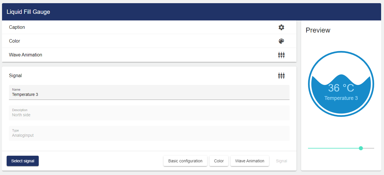 The widget displays the data of the selected analog signal as a wave. Depending on the value and the set limits, the filling level of the circle changes. When configuring the Level Measuring Instrument, there are many options and a preview to visualize the changes in real time. The slider also allows you to manually change the height of the measuring instrument in the preview.