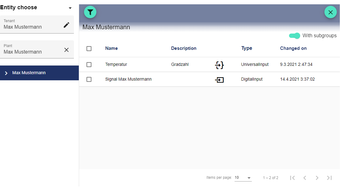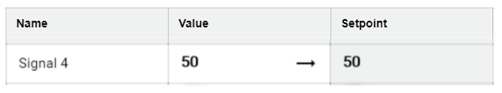 The Setpoint Table is used to compare an analog or digital input "value" ("name" and actual value of the signal) with an analog or digital output "setpoint". The name of the setpoint signal is not listed here. By clicking the corresponding setpoint, it can be set in the Dashboard. The Setpoint Table can be divided into several groups.