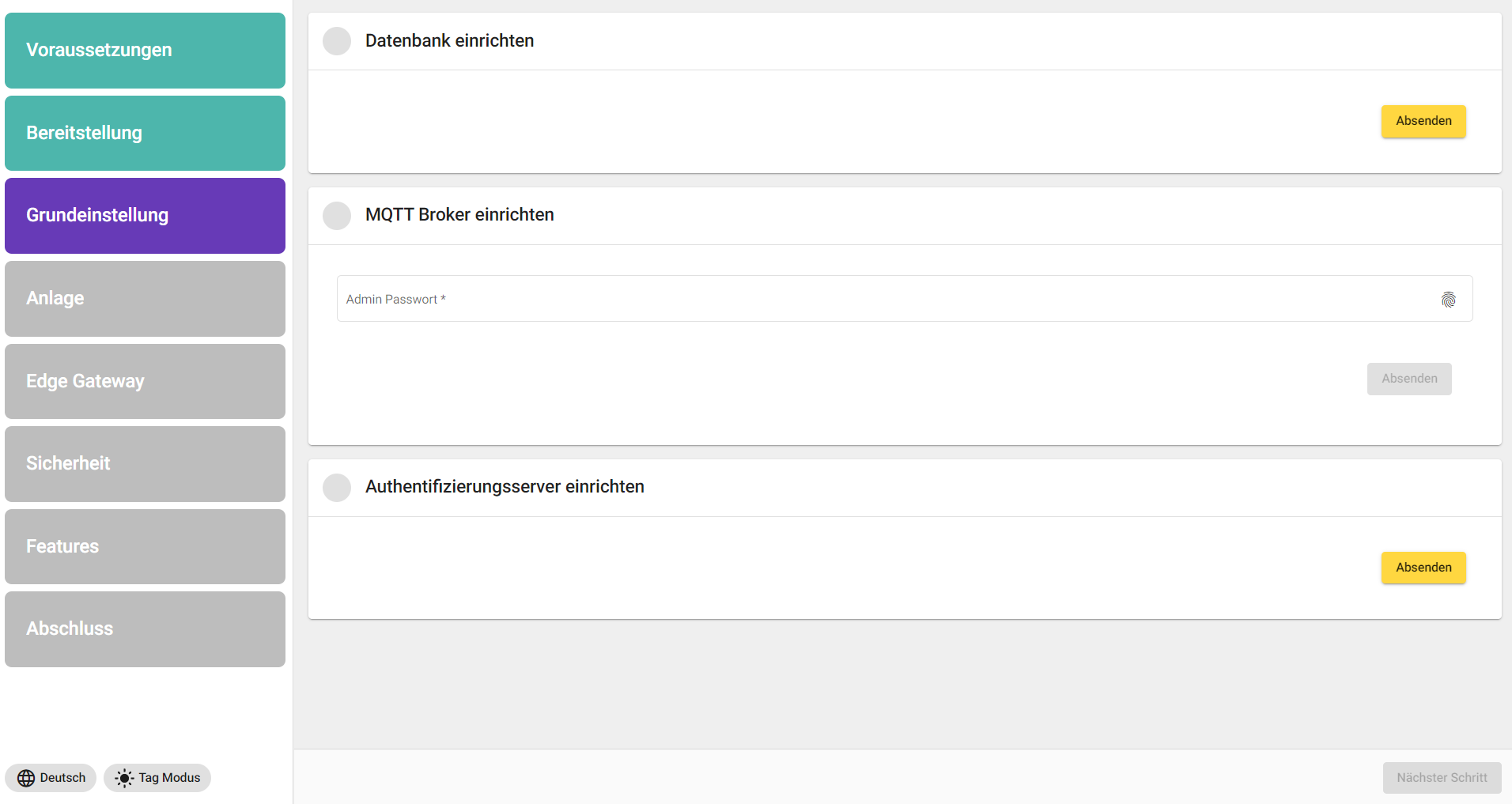 Basic setting | Databases and Server are established in the basic settings. When establishing the database, click on the "Send" button. Subsequently, you determine a password for your database and confirm your determined or generated password via the Send button. Passwords can be randomly generated via the fingerprint symbol. Subsequently, press the "Send" button at "Set up authentication server" to create the database. ![]() |