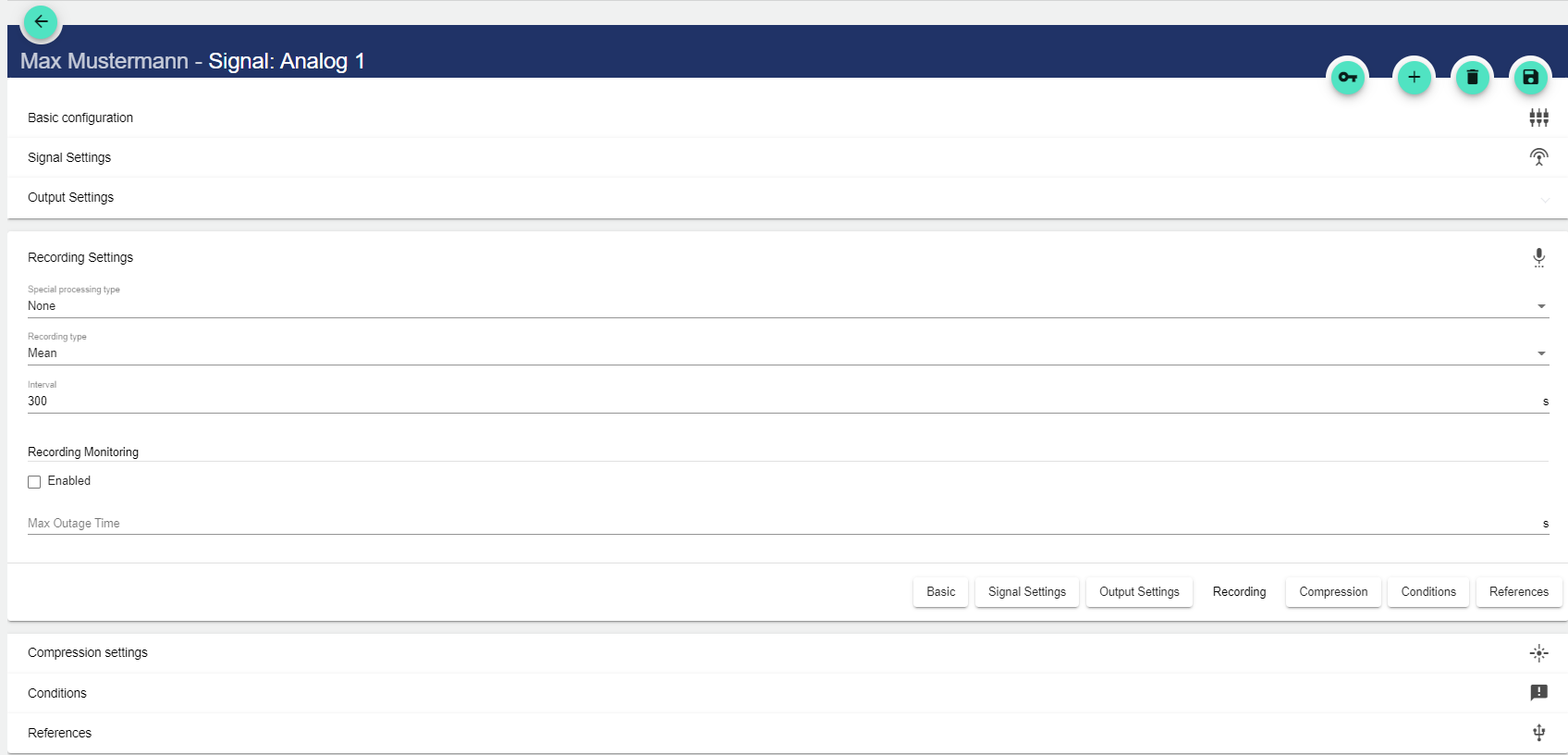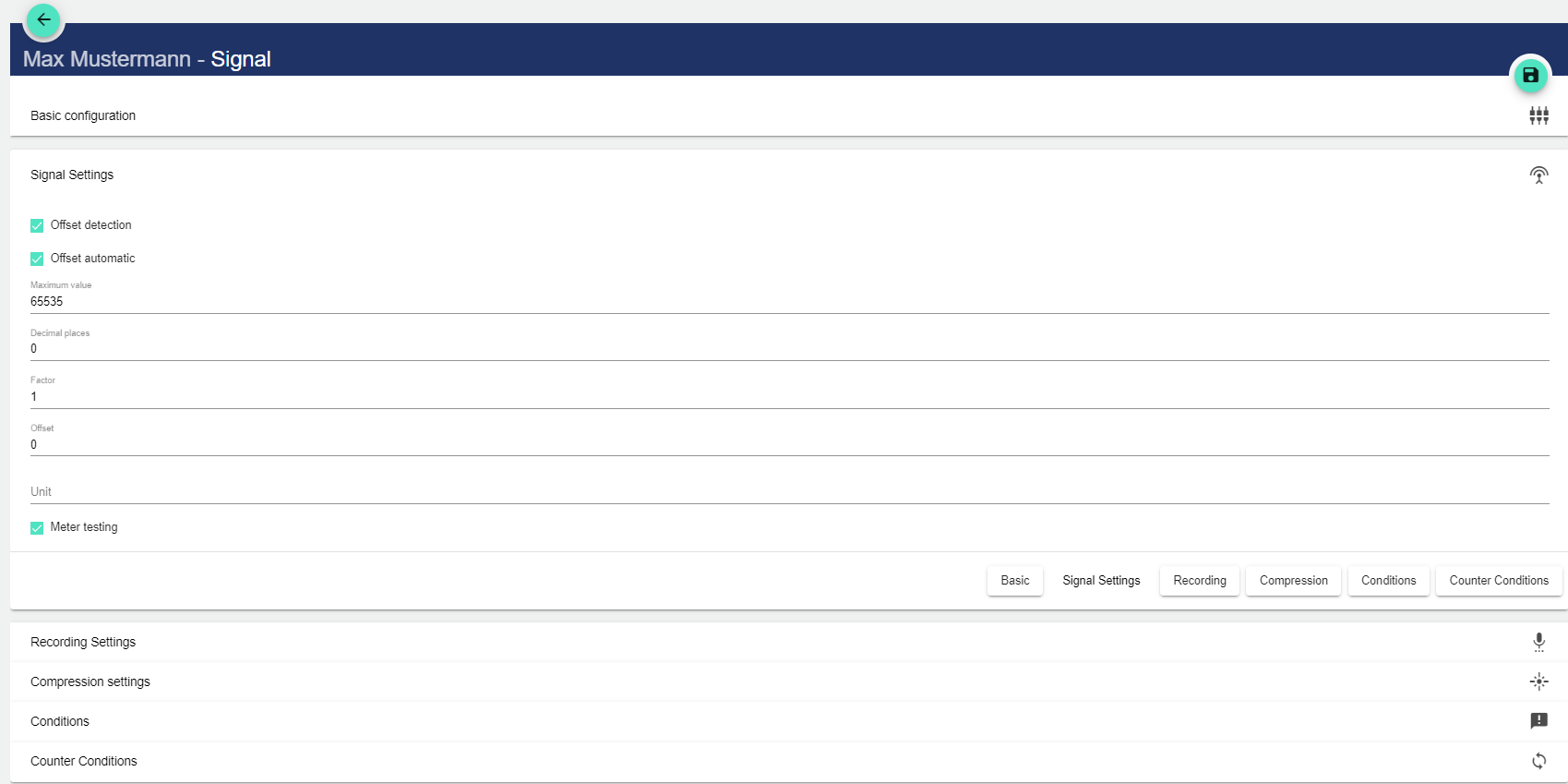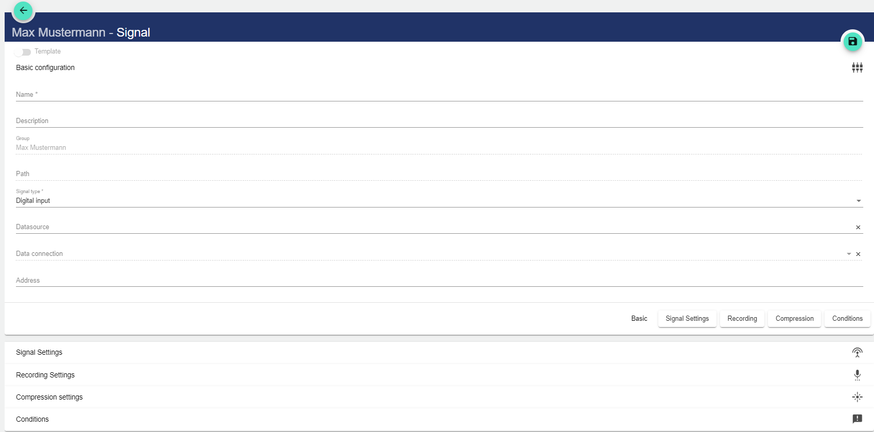 Assign the name of the Signal in the Basic Configuration. The Description field is optional. The Signal can also be created as a "template" (currently inactive). This allows you to simply add individual fields to the template in order to create new signals. The "Group" field shows the Group in which this Signal was created. The path is generated automatically by the system.