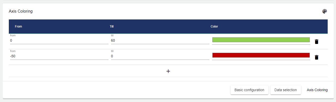 Under the "Axis coloring" tab, certain areas of the axis can be colored differently. The "From" and "To" fields are used to limit the range to be colored. The "Color" field allows you to select and choose the appropriate color.
