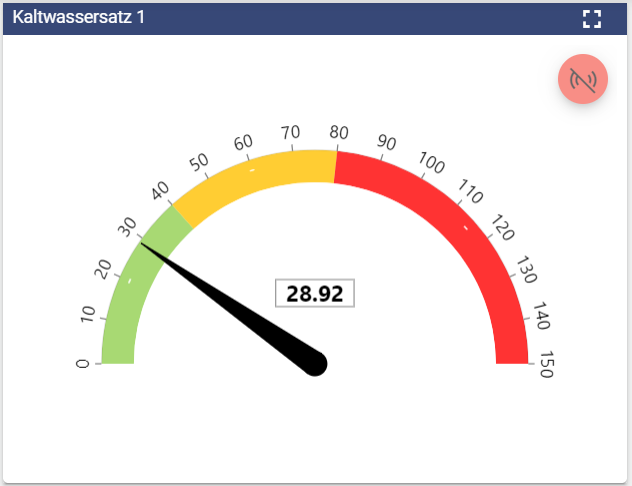 The Measuring Instrument visualizes analog input and output signals in the form of a tachometer with areas that can be configured in different colors. The red live mode icon in the upper right corner indicates that the widget is in livemode and working correctly.
