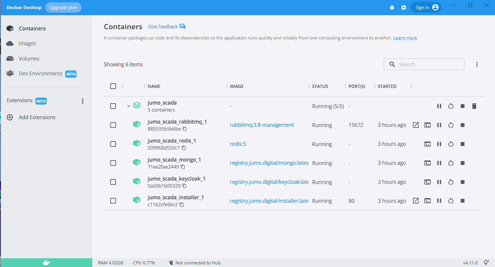 docker ps -q is a command to show all IDs. The command docker-compose kill stops all running containers. docker-compose down --remove-orphane removes all containers where the activity was not defined in the file, while the last two previously known commands re-pull JUMO smartWARE SCADA images and restart the container.