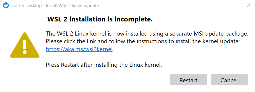 On Docker Desktop startup, Windows will prompt you to complete the WSL2 installation. The link in the prompt will take you to a website where WSL2 (Windows Subsystem for Linux 2) can be downloaded. All that needs to be done here is to execute "Step 4" and click on "Restart".