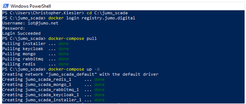 Upon pressing the Enter key, the data is updated by Docker "pulling" the JUMO smartWARE SCADA images from the previously entered path. However, this does not yet activate the containers. The process can take several seconds.