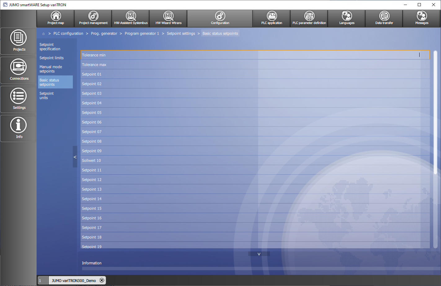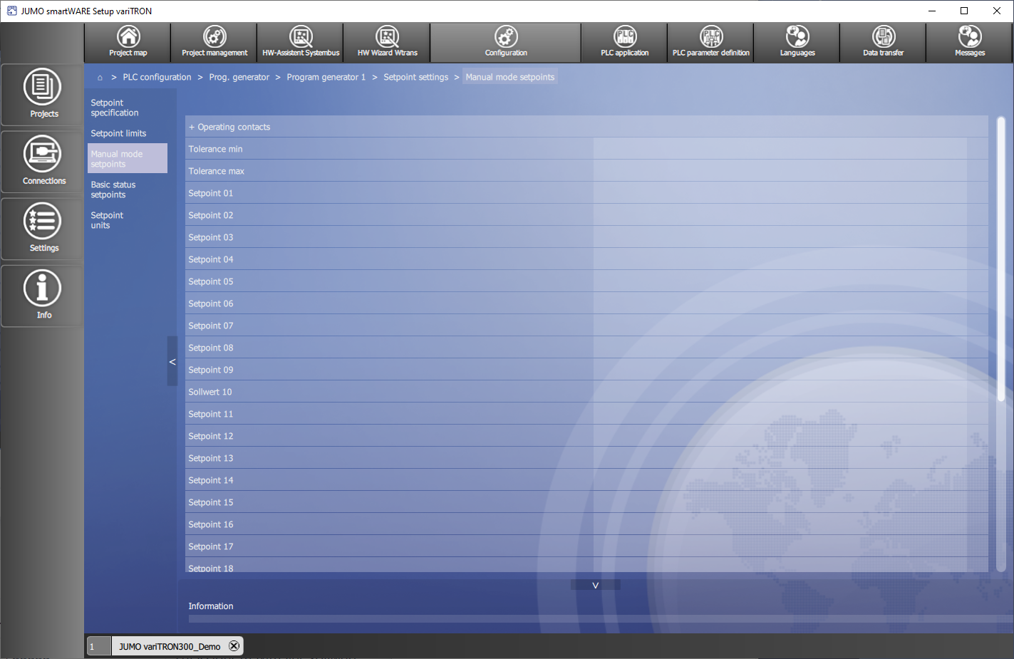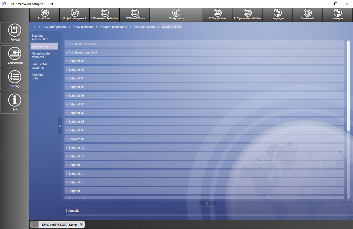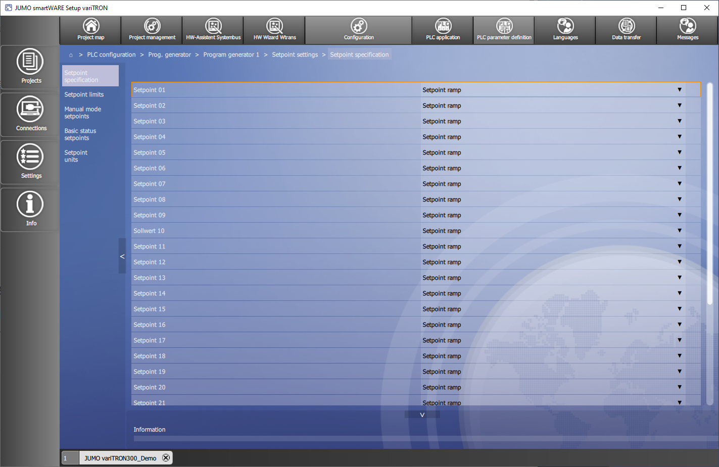 The settings for the setpoints are made in smartWARE Setup in the area Configuration under :Home: > PLC configuration > Prog. generator > Program generator x > Setpoint settings.