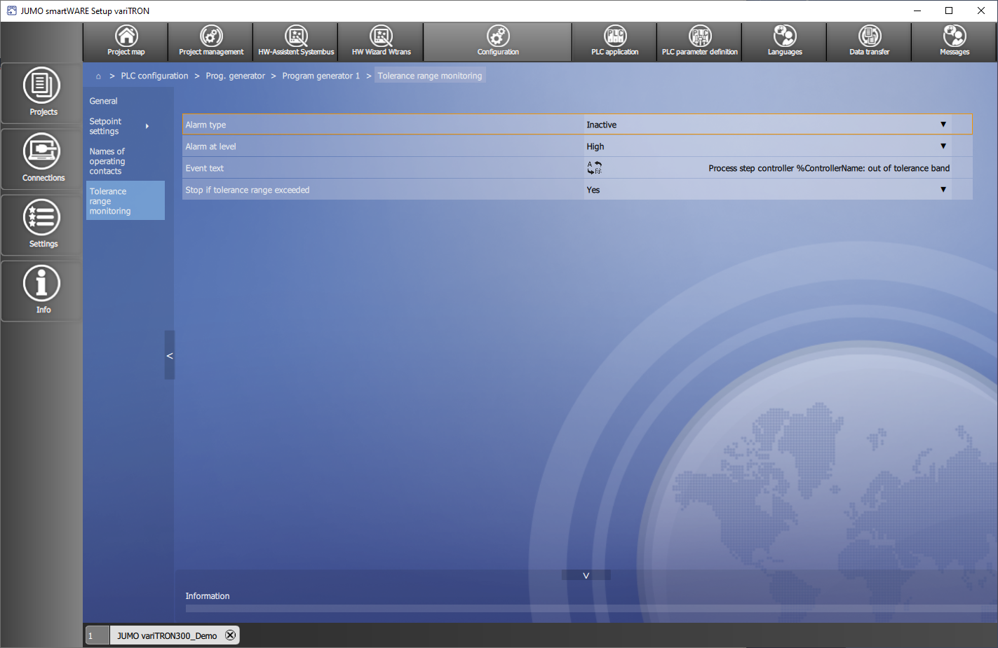 The settings for the behaviour of the tolerance band violation are made in smartWARE Setup in the area Configuration under